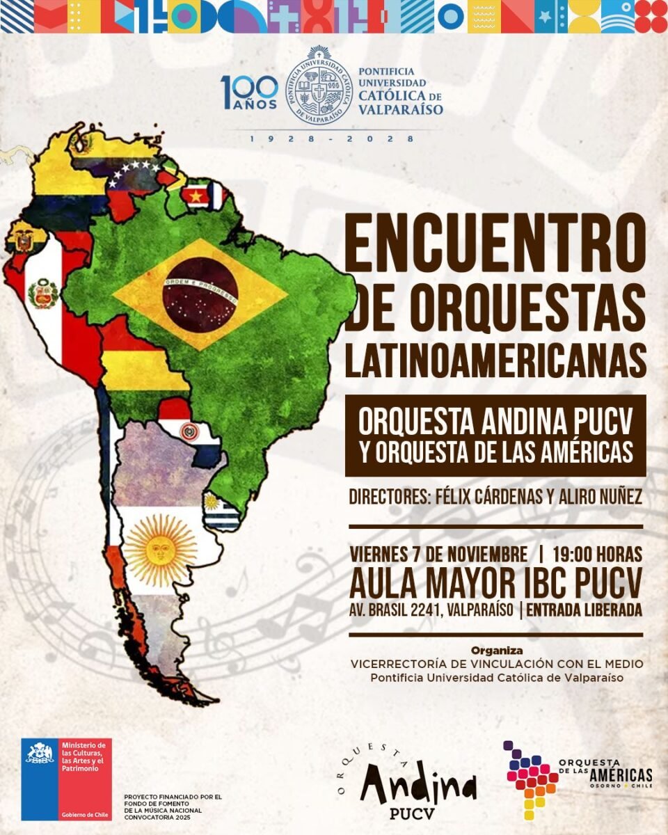 El próximo viernes 7 de noviembre a las 19:00 horas, el Aula Mayor del edificio IBC de la PUCV será escenario del Encuentro de Orquestas Latinoamericanas, un espacio que celebra la diversidad sonora del continente con la participación de la Orquesta Andina PUCV y la Orquesta de las Américas de Osorno. La entrada es liberada, sin inscripción previa.