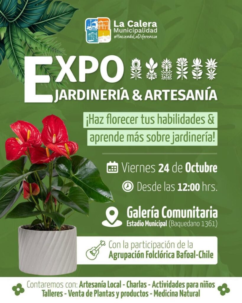 Este viernes 24 de octubre, desde las 12:00 horas, en la Galería Comunitaria del Estadio Municipal (Baquedano 1361), se realizará la “Expo Jardinería y Artesanía”, iniciativa que contará con la participación de emprendedores locales, artesanos y amantes de la naturaleza.