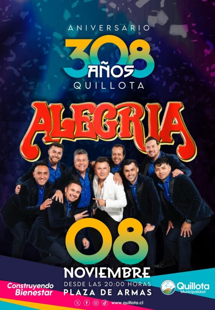 El evento contará además con la presentación del reconocido Grupo Alegría, que animará la jornada con sus principales éxitos, en una noche pensada para el disfrute de las familias quillotanas y visitantes.
